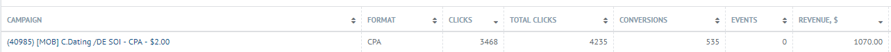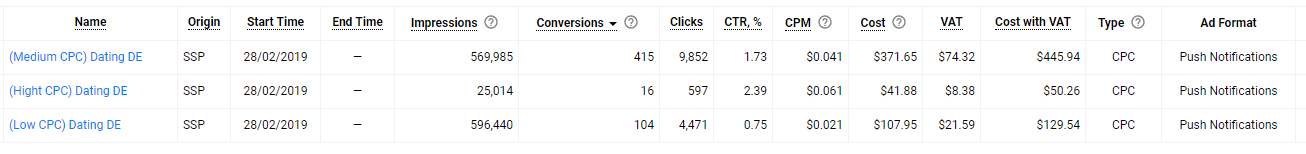 Dating is everywhere and needed by everyone, meaning, you can always find your audience 🙂 If, of course, you do everything right. I took the ClickDealer offer with a $2 payout per lead. PropellerAds has a lot of German traffic, while the minimum CPC is only $0.005.
