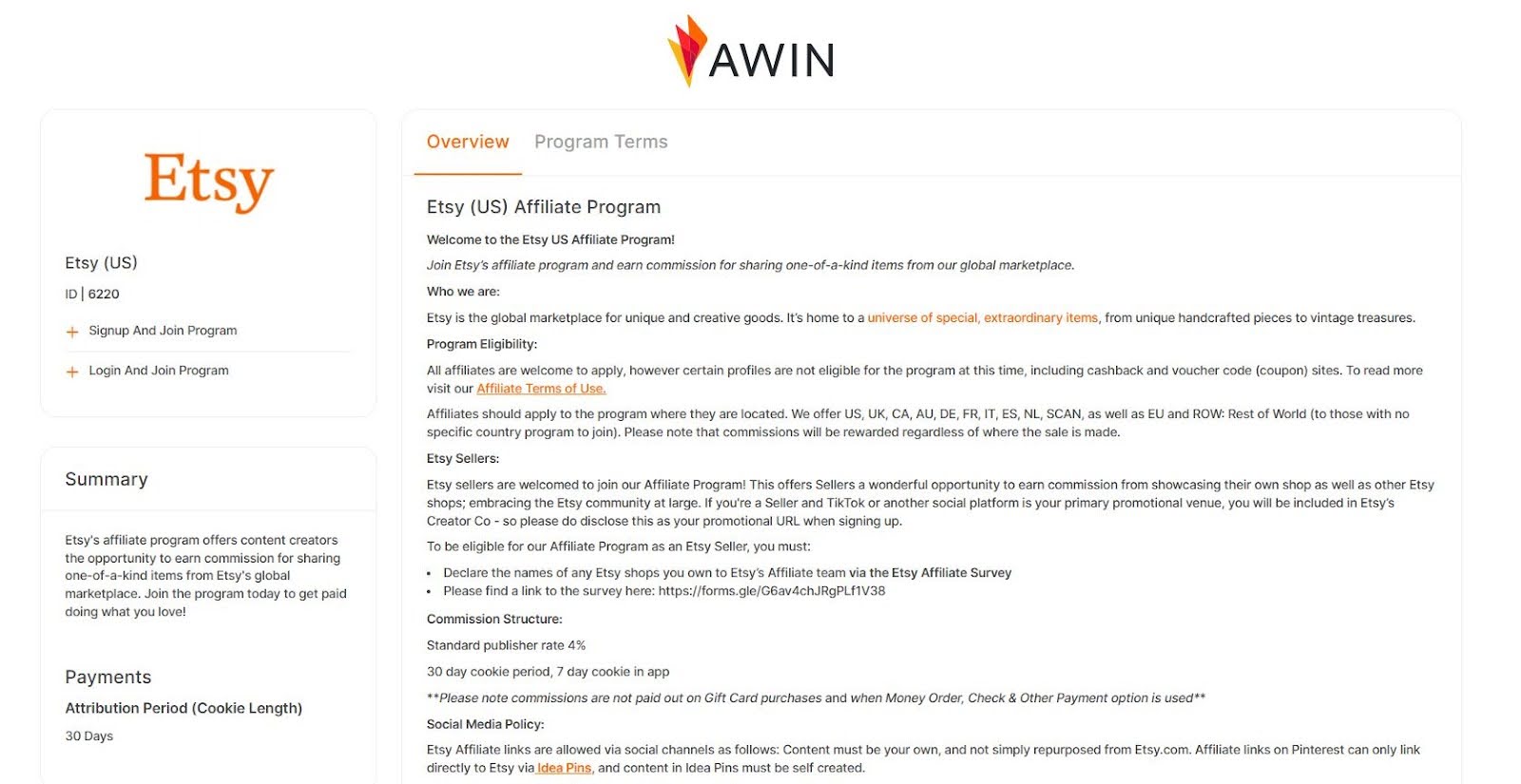 Etsy runs its program on Awin, so you get standard tracking and easy deep links. The public help page states a 30-day cookie on web visits, regional materials, and Awin profiles add that app purchases attribute for 7 days, which is generous for considered buys and gift guides.
