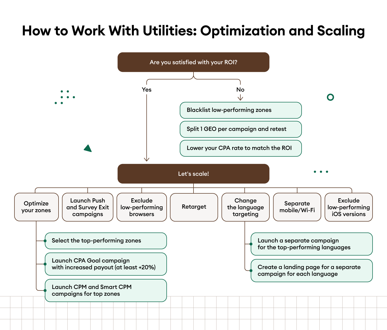 Once your utility campaign is live, it’s all about smart optimization and scaling. This interactive flow breaks down each stage — from analyzing early performance to adjusting bids and creatives — with practical tips at every step.