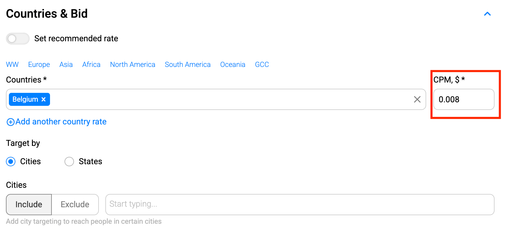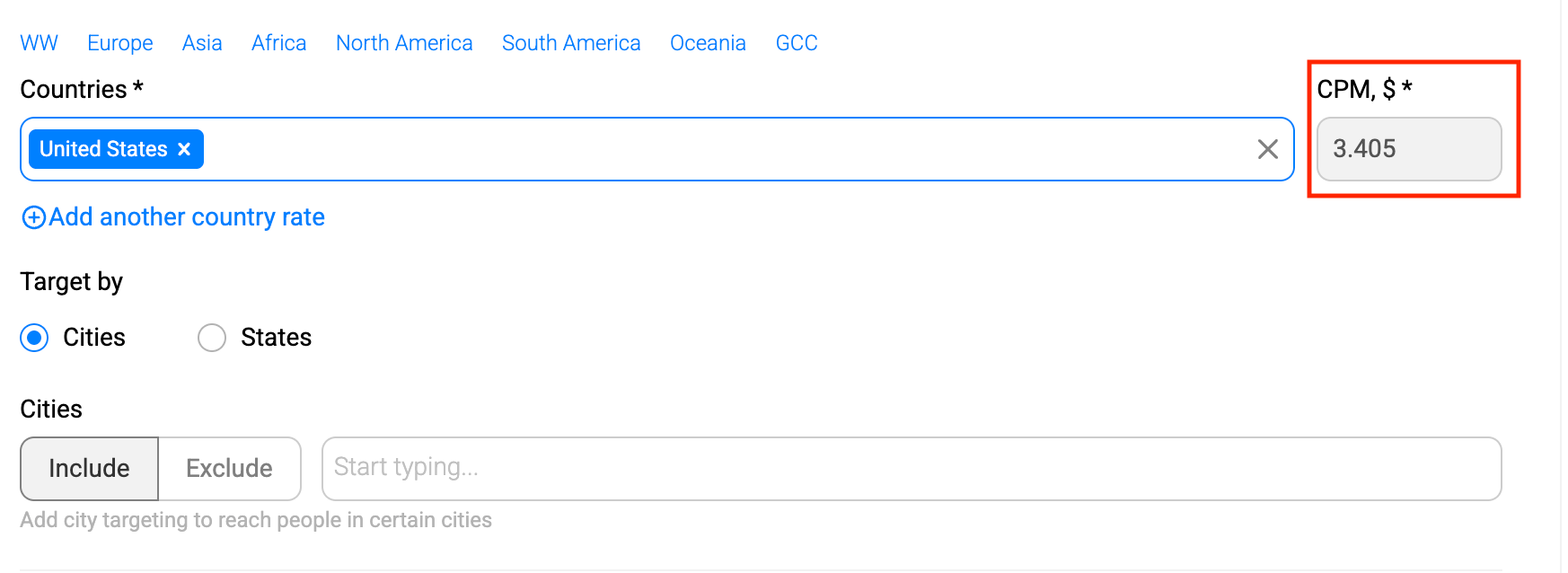 And what if you have multiple GEOs in one campaign? Then you can add another country rate to add more countries and assign a separate CPM bid for each one.