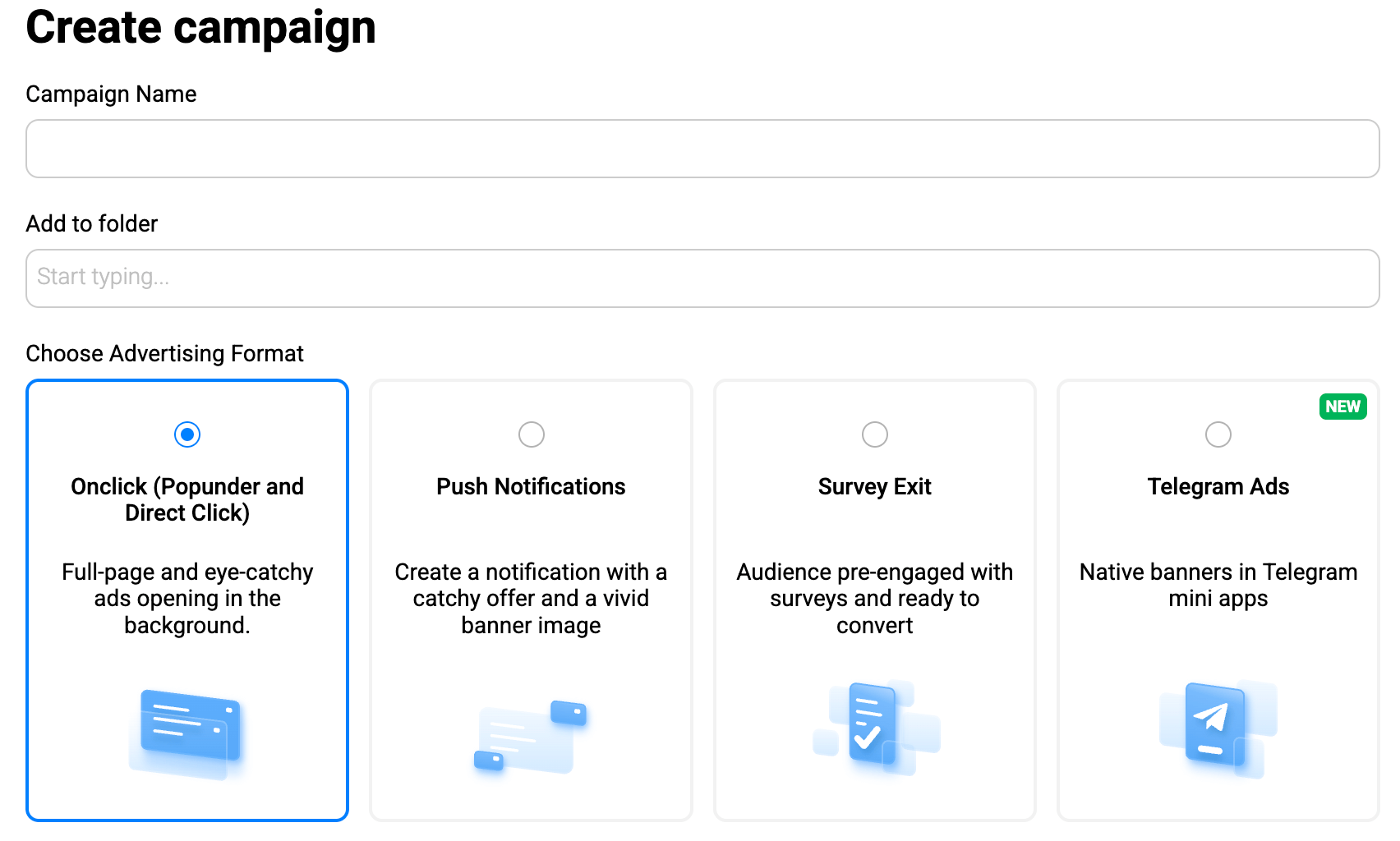 In your PropellerAds account, click Create Campaign and choose OnClick (Popunder) as the format.