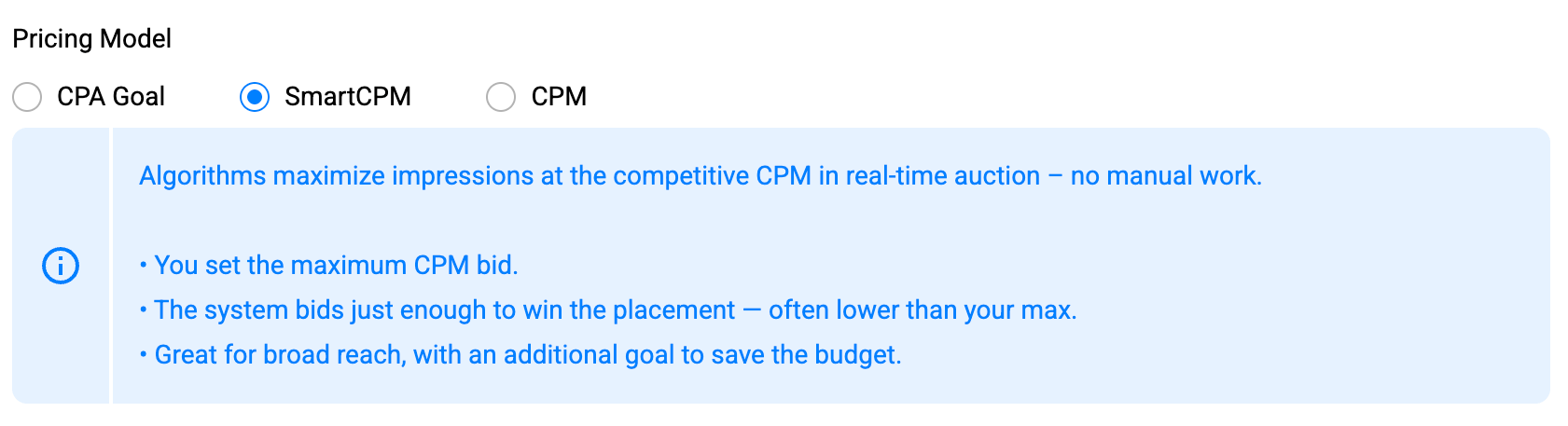 SmartCPM: this is an automated model based on the algorithms that maximize impressions at the competitive CPM in a real-time auction. The placed bids are optimal to win the placement – often lower than your max.