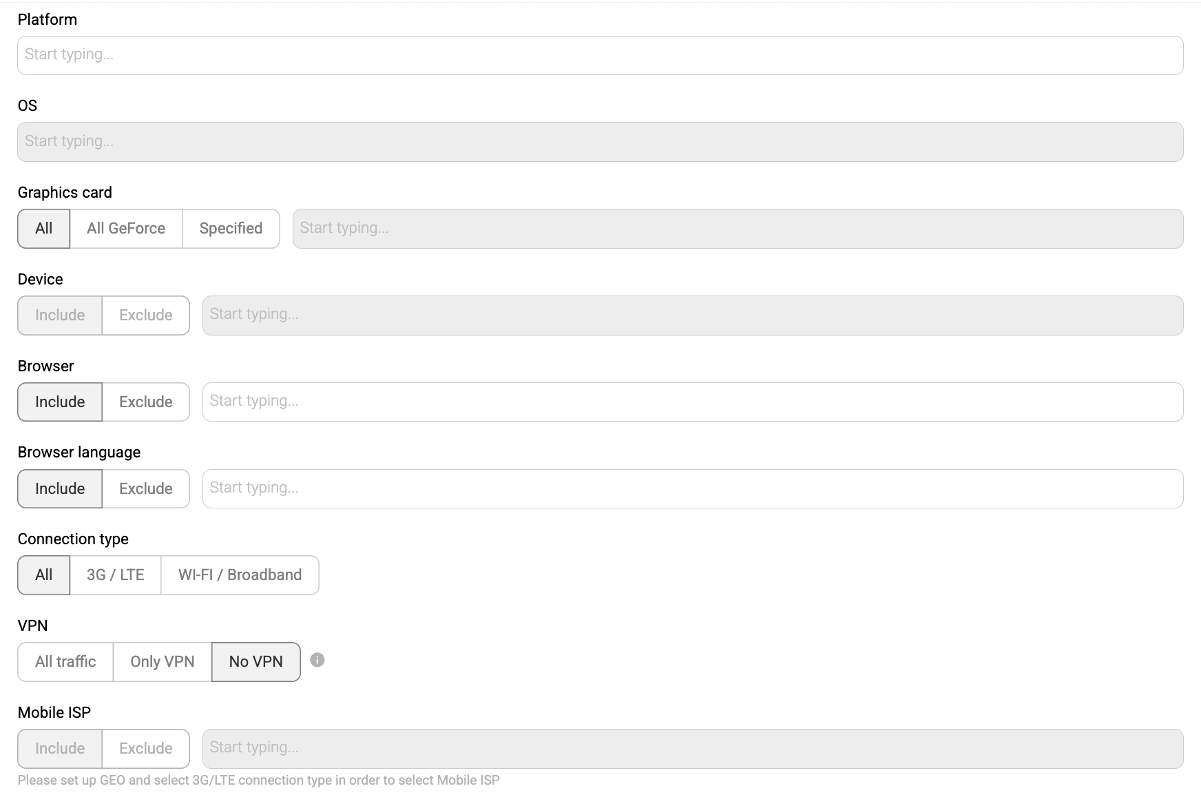 • Connection type: All, 3G/LTE, wi-fi/Broadband