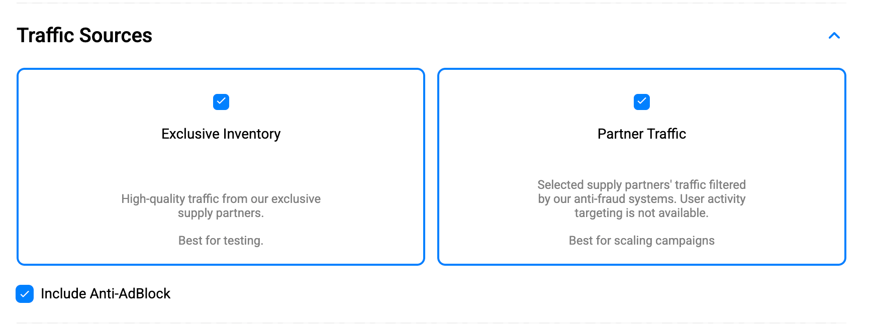 Recommendation: start with Exclusive Inventory to validate your offer + landing page, then add Partner Traffic when you’re ready to increase reach.