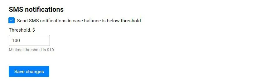 Get an SMS notification every time your account balance reaches the predefined threshold. Please note that this option is available only for Silver, Gold, and Platinum account holders.