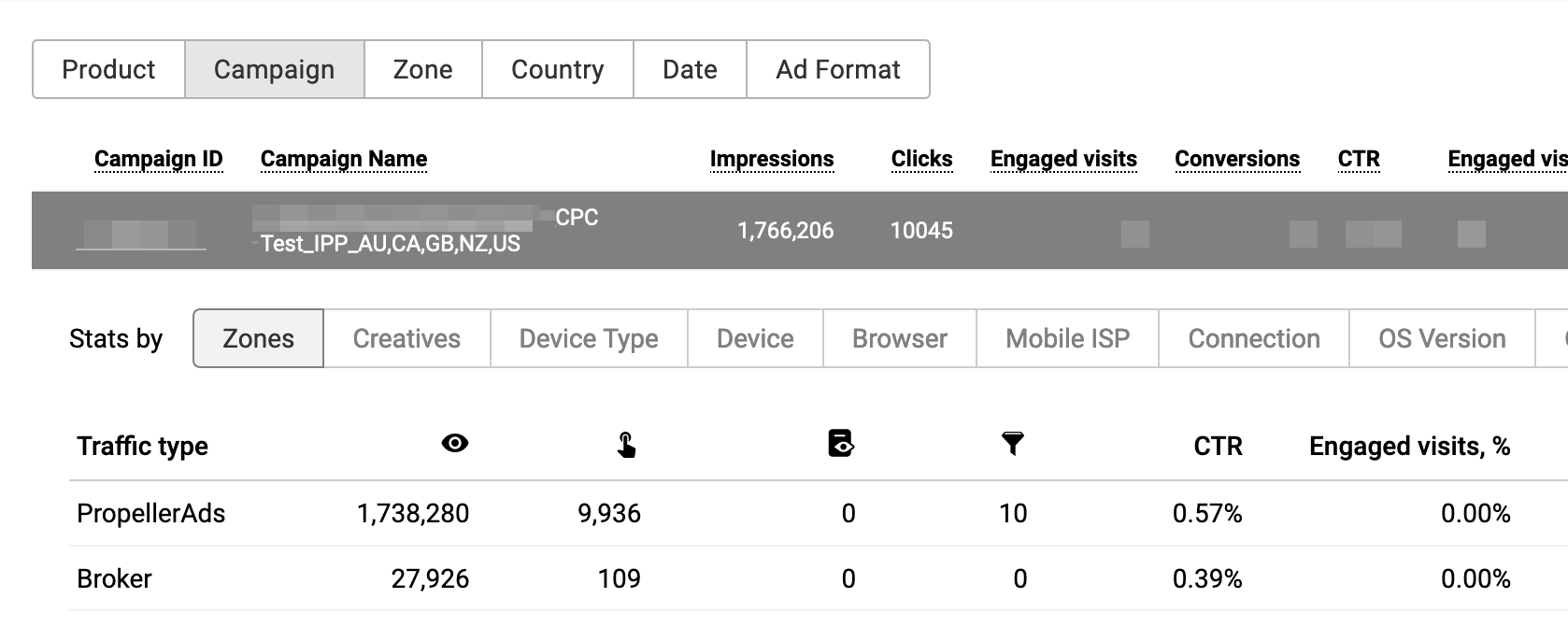 Apply the “Campaign” filter to your statistics and click on any campaign to open a new “Traffic Type” table. Compare the performance of Broker and PropellerAds traffic to see what works best for your offer.