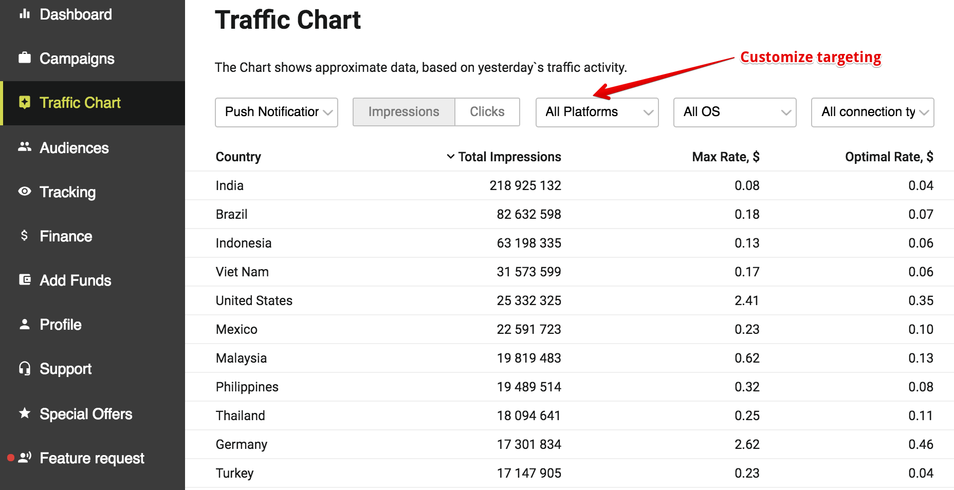Get the automatically collected system data and see the number of total impressions per country, maximum and recommended bids. You can also check the traffic amounts for your custom targeting (Format, platform, OS, and connection type).