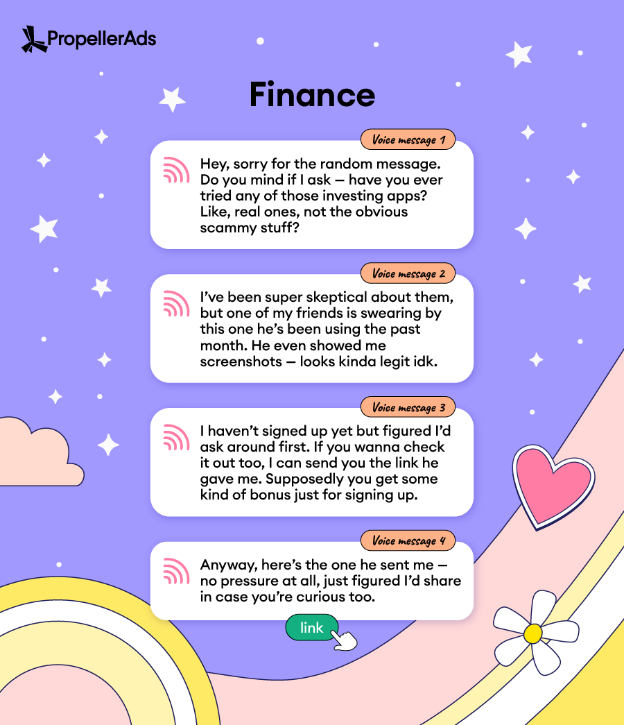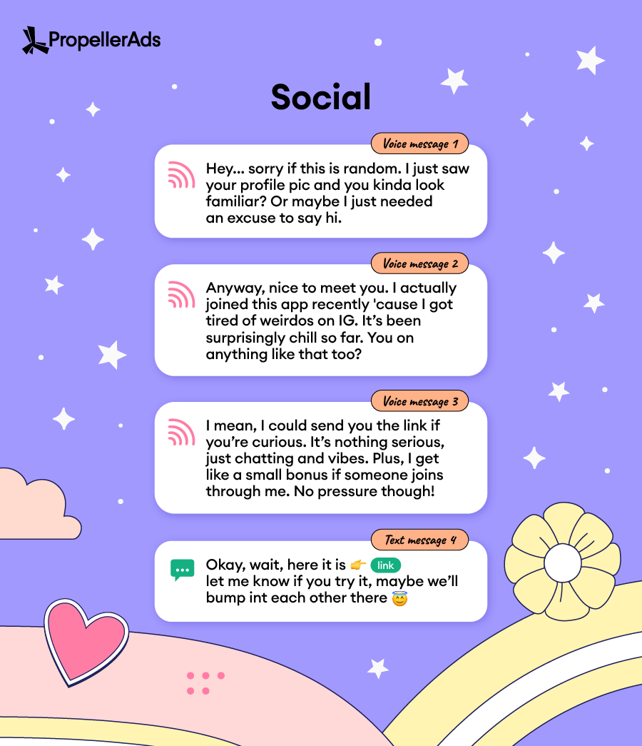 Here, your ad stops looking like an ad and turns into a friendly conversation. You send a voice message, which already intrigues a user: You usually receive voices from someone you know, right? So, instead of sending a standard spammy message, your bot invites a user to speak as if you are already friends. This approach can be especially warming when it comes to Social apps for matchmaking.