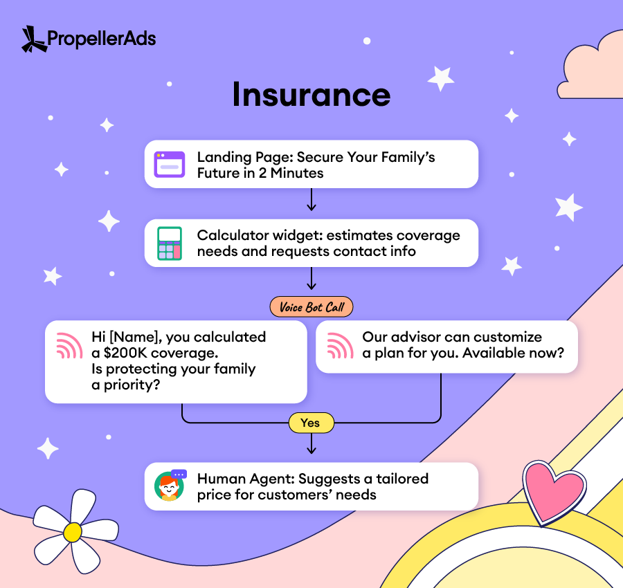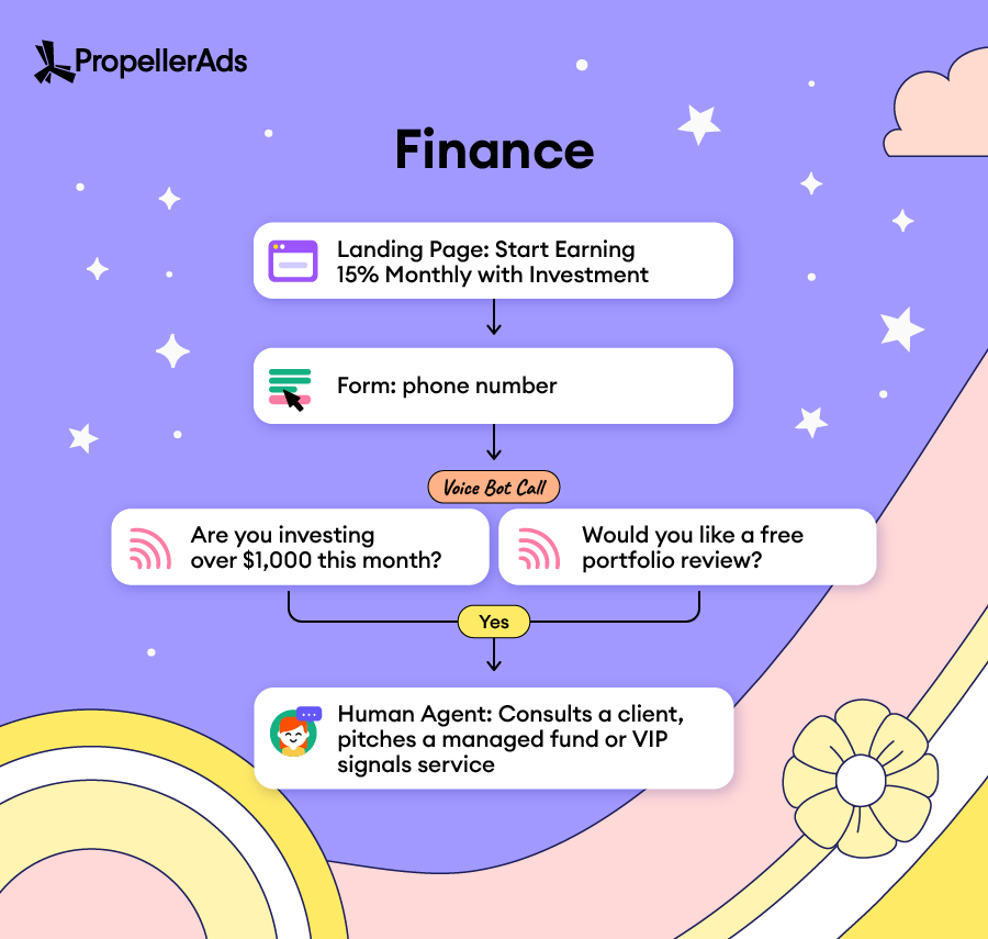 - Phone bots. If a funnel requires some contact with a user after they make an order, voice calls from bots can save money on real assistants. They help identify and filter out users who are unlikely to convert before connecting them to a human agent, and they still feel more personal than a written form.