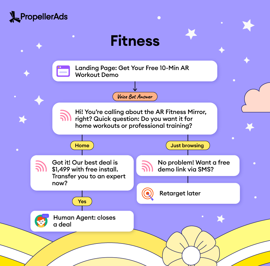 a user comes to your landing page → clicks the Call button → a voice bot automatically answers a call → the bot asks questions → redirects a user to a human assistant → a user converts
