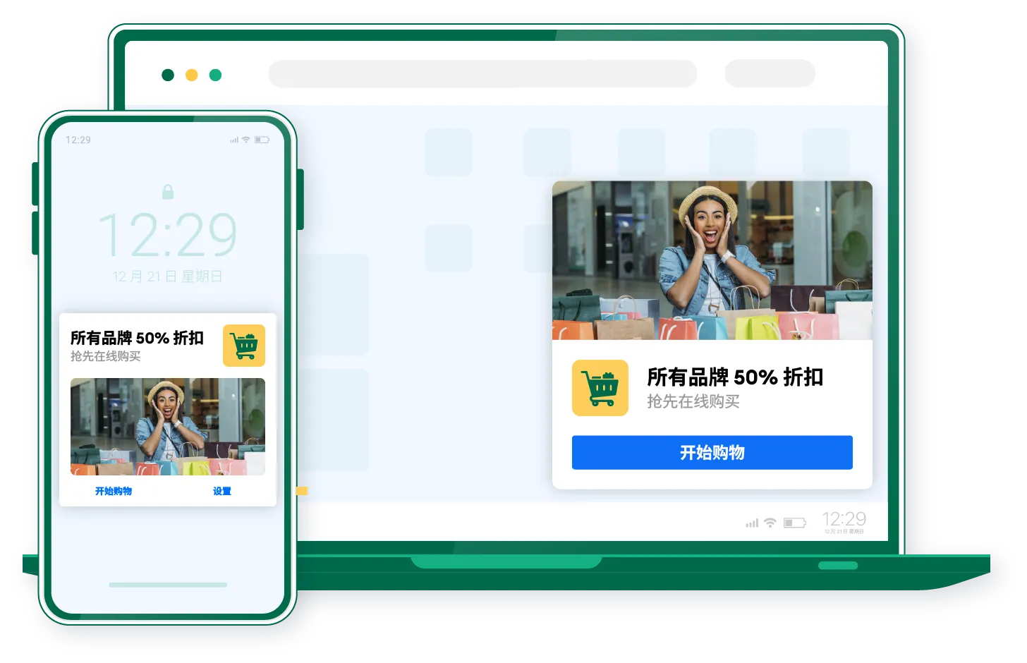 即使用户未在浏览网页,您仍可通过 Push 广告在其移动设备上精准触达。您可以确信,您的信息将被潜在客户第一时间看到。